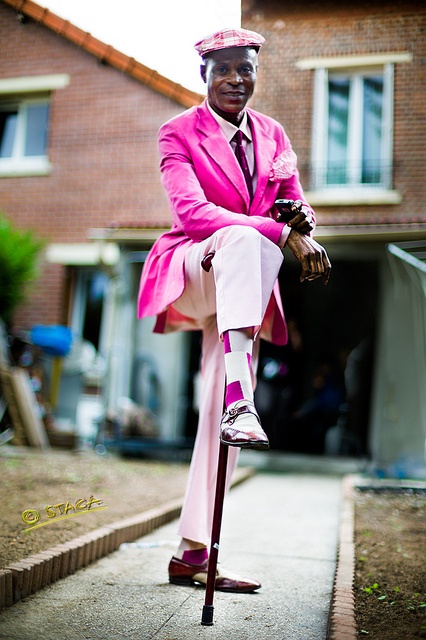 The battle was between dressed up and  overdressed  flamboyant black man showing of their outfits. They didn’t even bother to take of the price tags, or rather show of the price tags and  the labels inside the clothes. Lots of Dries van Noten, like the man in the pink suit, Gucci, Cavalli, Yohji Yamamoto and Prada. One of the Sapeurs must have been inspired by John Galliano’s look… It was a hysterical and funny event. I wanted to know more about this phenomenon.