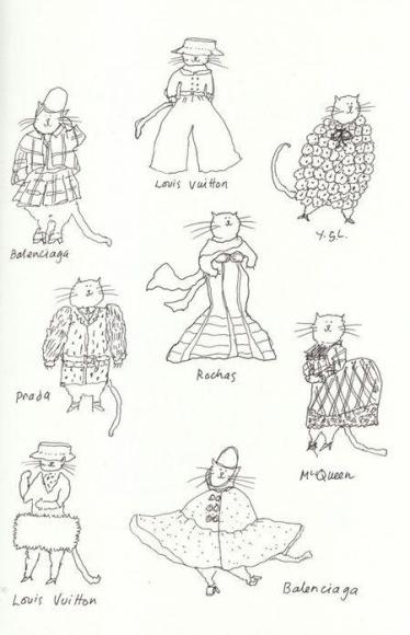 In 2006 the book The Catwalk Cats was published. It is based on 20 years’ worth of sketches and notes she has faxed to her husband while they were apart. “Instead of calling him when I was in Milan or when he was traveling in India, I would do a sketch of where I was and put the cats in my place”. Didier Malige (her husband) photographs accompany Grace’s drawings throughout the book. Grace is well-known for her love for cats and so is Didier.