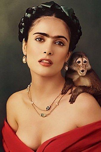 (Salma Hayek as Frida Kahlo in self-portrait with the earrings Picasso made for her)