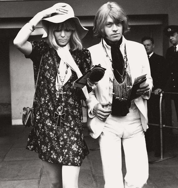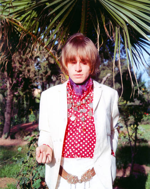 Brian Jones and Anita Pallenberg were a couple from 1965 untill she started dating Keith Richards in 1967. Anita suggested he always tried to look like Francois Hardy. He certainly took a good swing at it, almost hitting the look of darling Hardy, on the very fine nail. Jones’ biographer Geoffrey Giuliano writes about him and Pallenberg: “Together they forged a revolutionary androgynous look, keeping their clothes together, mixing and matching not only fabrics and patterns, but cultures and even centuries. Jones would parade the streets of London wearing a Victorian lace shirt, floppy turn-of-the-century hat, Edwardian velvet frock coat, multi-coloured suede boots, accessorised scarves hanging from his neck, waist and legs along with lots of antique Berber jewellery.”