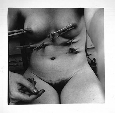 Her nudes often recall Bellocq‘s haunting Storyville portraits of New Orleans prostitutes. One startling photograph of her legs bound tightly in ribbon or tape, her hand holding a striped glove that rests between her legs, has traces of the disturbing doll photographers of the German surrealist photographer Hans Bellmer.
