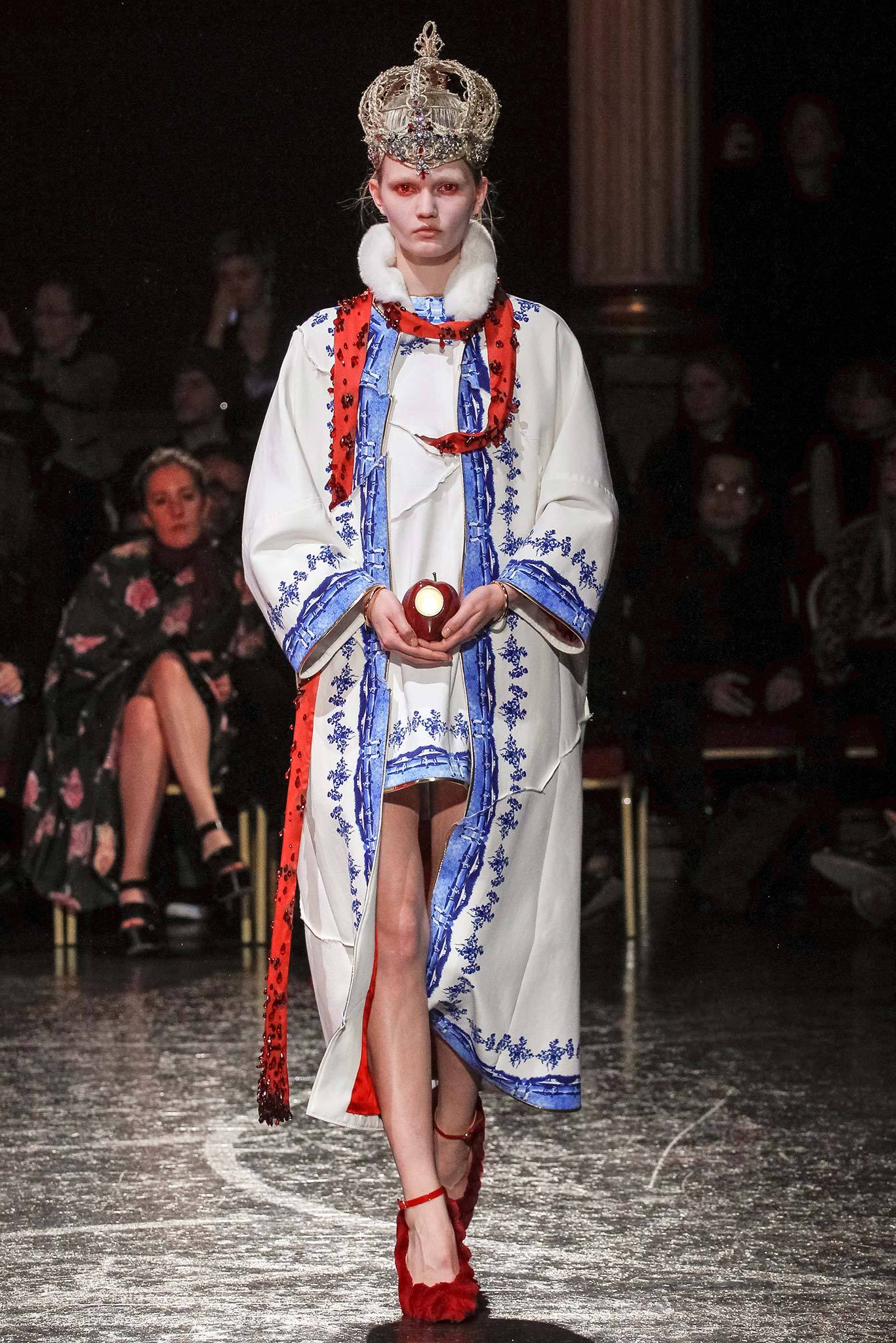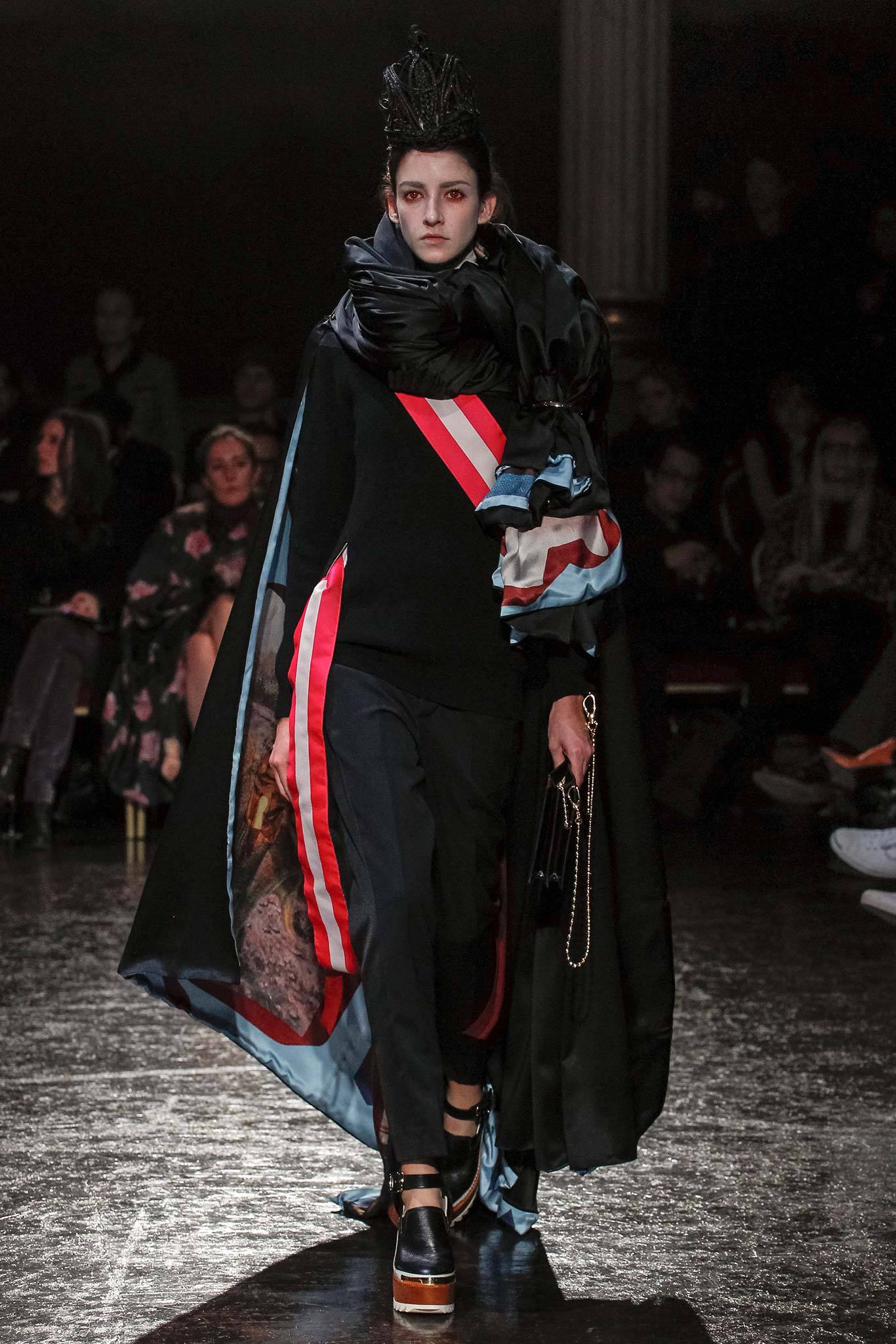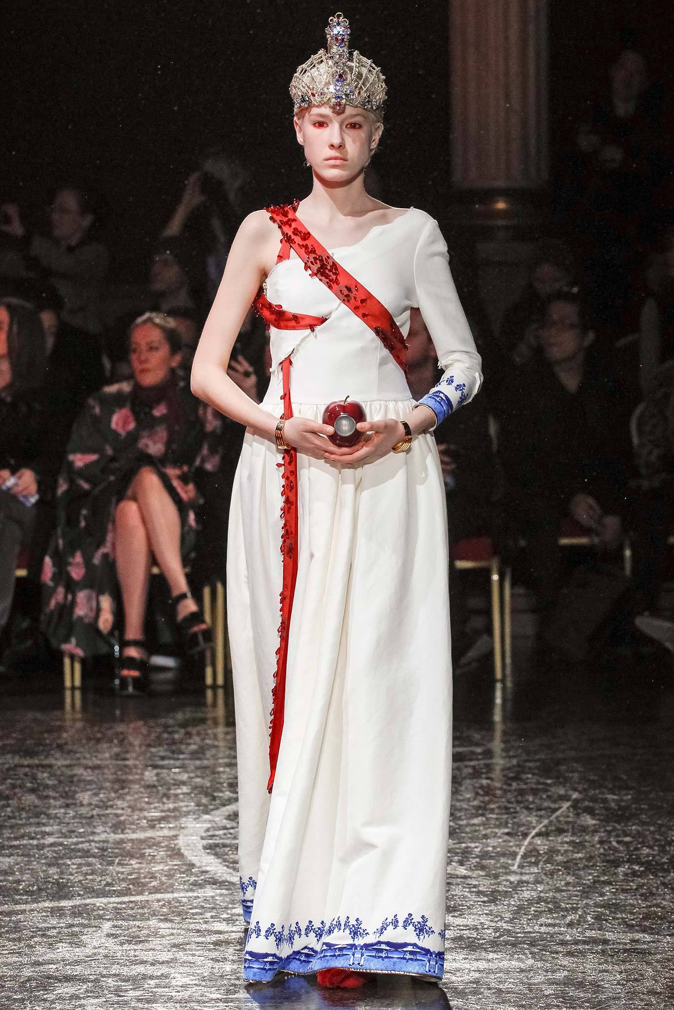 Jun Takahashi turned his models into fairytale queens, albeit wicked ones. If they looked angelic in their crowns made out of braided hair and rhinestones, their blood-red contact lenses and red mascara ensured an eerie quality “like vampires. I wanted to show how cold-blooded the girls could be,” he explains.