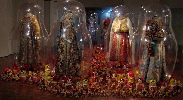 A series of objects or images inextricably linked to Russia: Russian matrioshkas or Russian dolls, vodka, the fur hat, the long queues of the Soviet era, the Volga … These stereotypes give a distorted image of contemporary Russia and obscure the diversity of its peoples, cultures, styles, and historical periods. By integrating these clichés into the scenography of the exhibition, A.F. Vandevorst makes us rediscover modern Russia. Like the Russian dolls which hold inside them a series of smaller dolls, the exhibition comprises several dimensions in which the historical collection of clothing of the State Historical Museum of Moscow is confronted with ever different contexts.