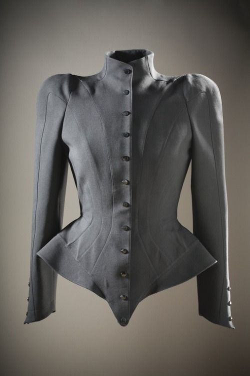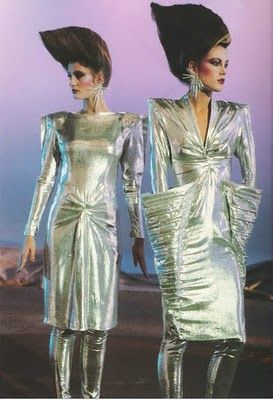 Mugler, over the next two decades created a style that was very much of its time: it was strong, malicent and sometimes almost cruel. Shoulders were wide and padded; waists were wasp like. Prints were banished: Mugler”s clothes came in solid, dominating colors. Collars had exaggerated points, or flame like cutouts. The insect kingdom was a constant influence, as were the ladies and gentlemen of film noir. PVC was often used as his material for his runway pieces, used to create space and robot themes. 1984 marked the 10th anniversary of the creation of the house. The Fall/Winter of 1984 85 collection was presented in a mega show before 6,000 people at the Zenith in Paris. It was the first fashion show in France ever opened to the general public.