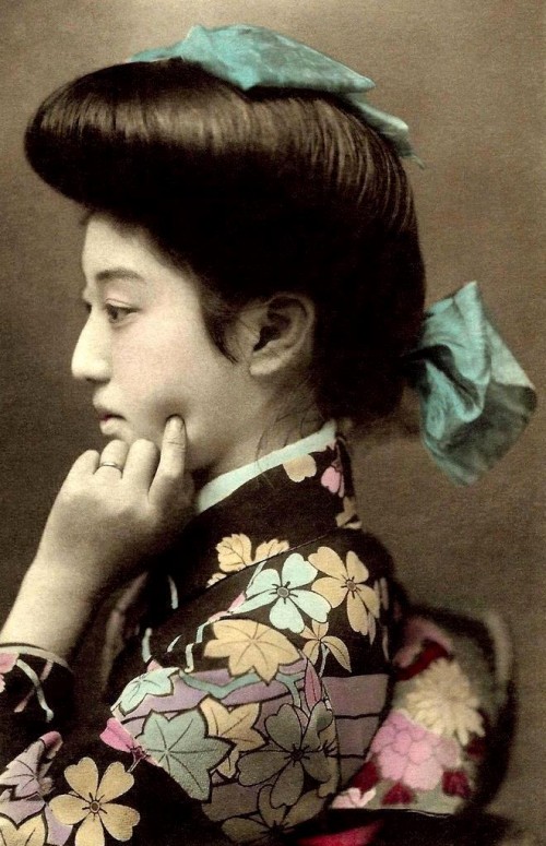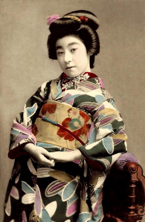 The kimono looks like it was influenced by the colorful garb of the Chinese court. As with many Japanese arts, a Chinese idea was taken and refined until it became a Japanese symbol all its own.