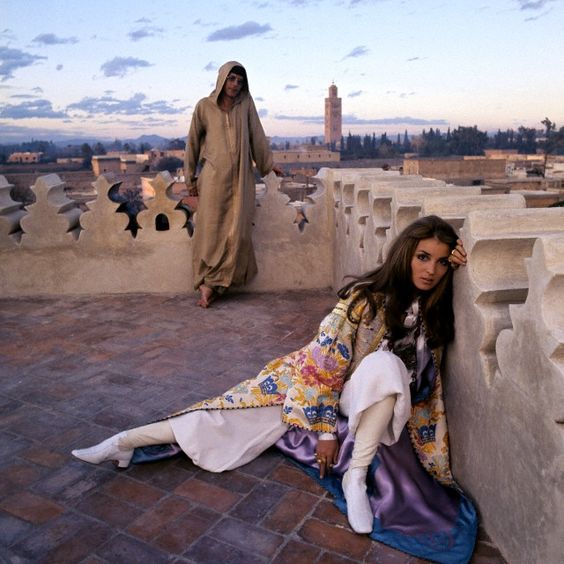 Yves Saint Laurent and his life partner, Pierre Bergé, who launched the Saint Laurent fashion house with him in 1961, visited Marrakesh, Morocco, in 1968, and became enamored with the colors, textiles, and sensuality of Moroccan culture. Saint Laurent fashioned caftans for his fabulous pals like actress and socialite Talitha Getty, her playboy husband, John Paul Getty, Jr., and supermodel Marisa Berenson. In January 1969, the Gettys were photographed by Patrick Lichfield wearing caftans on a Marrakech rooftop, which became an iconic image that defined what’s known as hippie or boho chic.