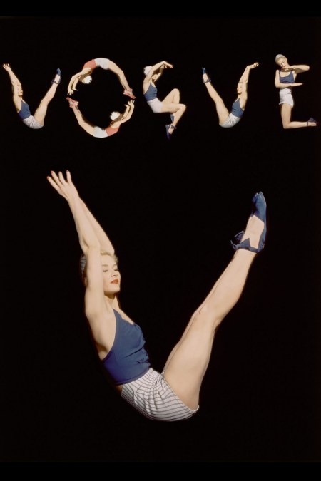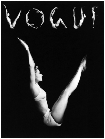 In this cover of Vogue magazine, Lisa poses in a blue and white bathing suit while sitting in a ‘V’ position, to spell out the word ‘Vogue. The first, black & white picture is a study for the final one (third picture).