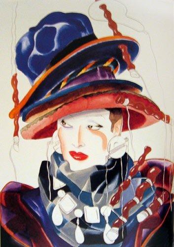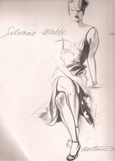 Jerry Hall became Antonio’s perfect muse. Jerry was sixteen years old when she arrived (from Texas) in Paris. She was an Antonio drawing come to life-or was soon to become one. Antonio felt her face was to pudgy and she had to lose weight. Antonio had a sort of Pygmalion effect on Jerry, seeing possibilities of what she could become and illustrated her in this way. He chiseled her face, arched her eyebrows and deepened her eyesocks, eerily predicting what she would look like a few years later when she became world’s most sought-after model.