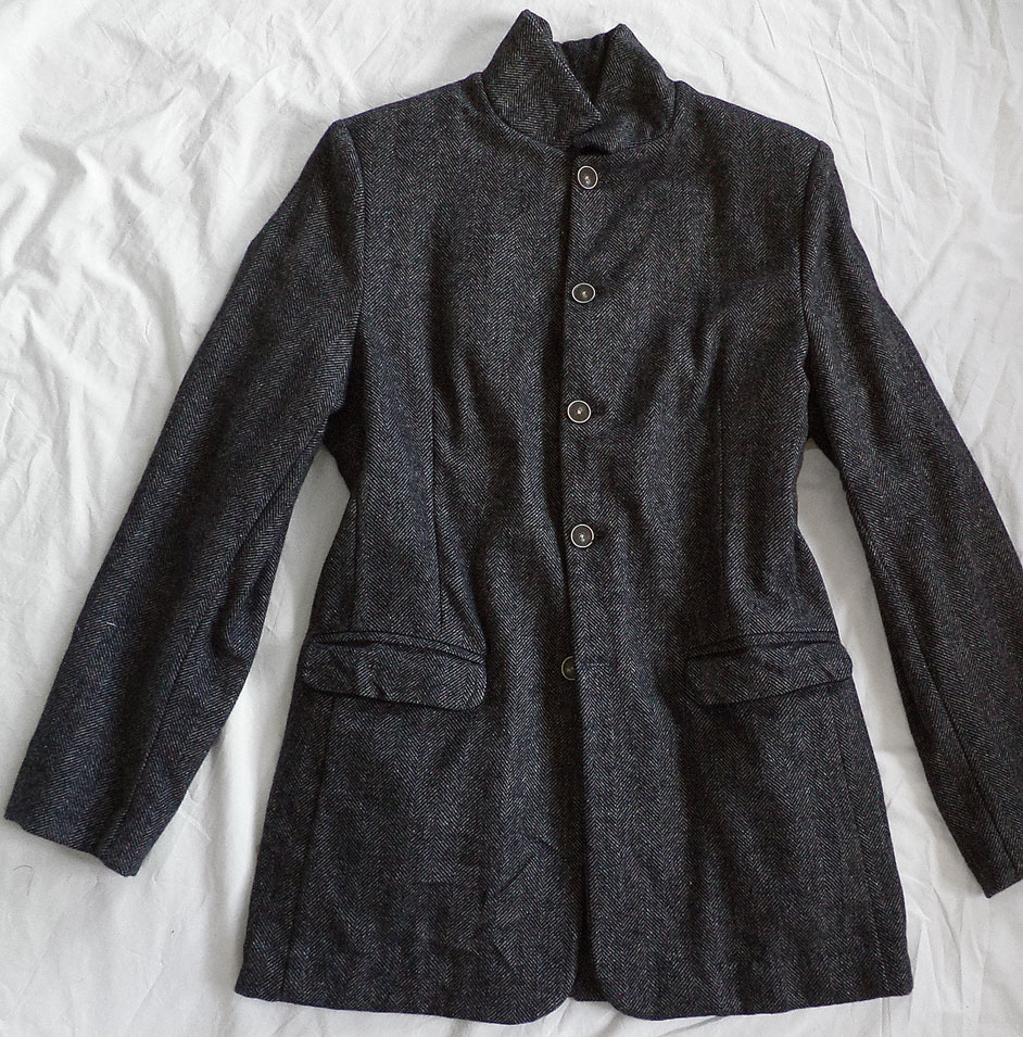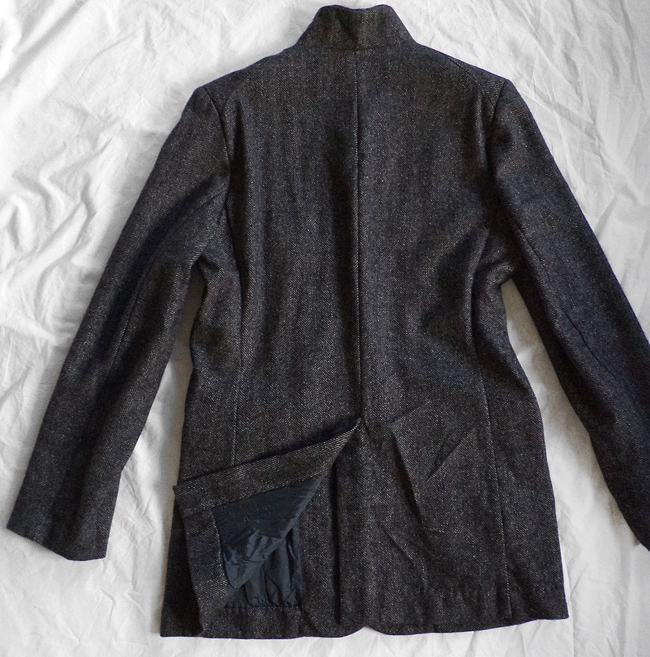 €485,- . Sizes Size: Eur 46 -USA 36 Back length: 78cm- 31.2inch Sleeve length: 65cm – 26inch Colour Black/grey wool blend herringbone tweed Details fully lined, 1 inside pocket, visiblehand stitched finishing Purchase Details You will receive a PayPal invoice. Please read our terms and conditions policy for shipping & handling costs.