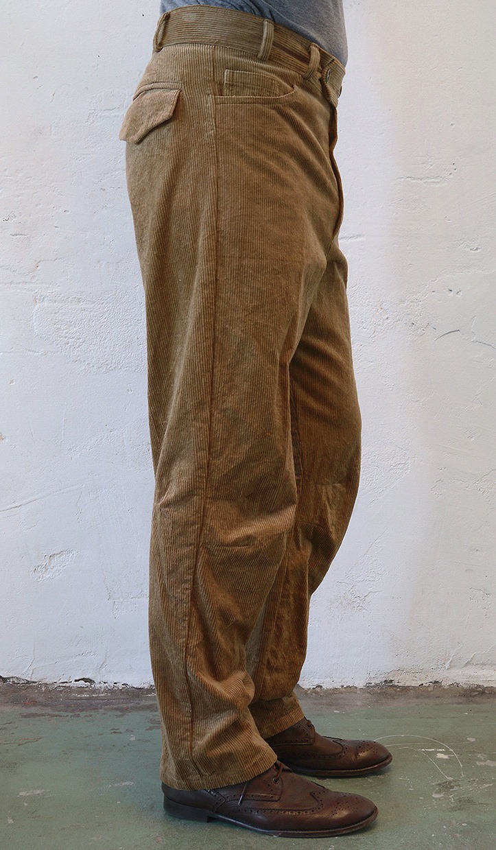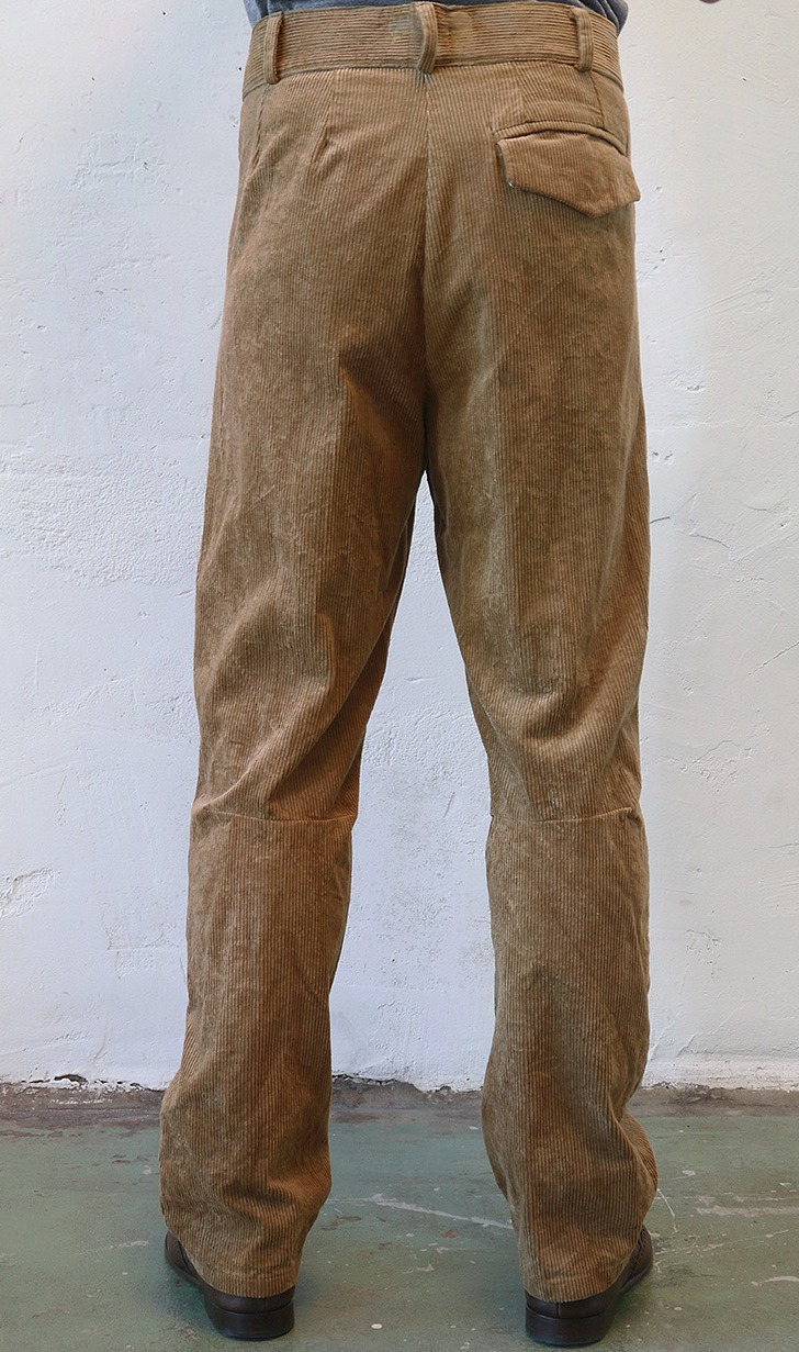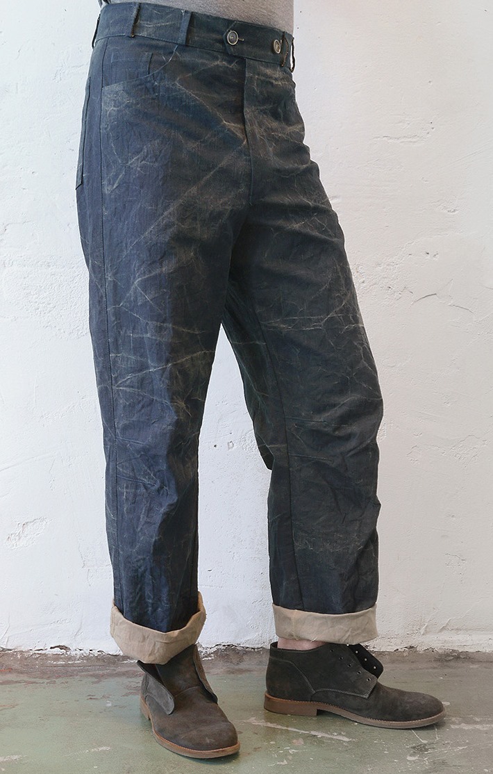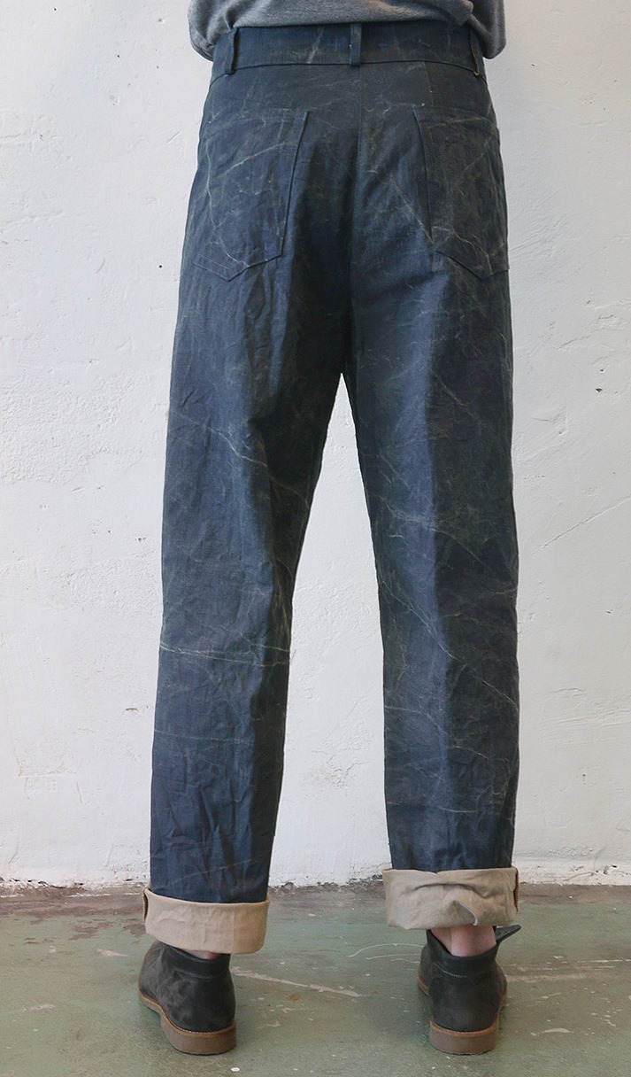 €245,- (On hold for photoshoot) . Sizes Size: Eur 52/54 -USA 42/44 Waist: 95cm- 38inch Outer leg: 112cm- 44.8inch Colour Indigo coated, khaki coloured inside 100% cotton Details Wash inside out Purchase Details You will receive a PayPal invoice. Please read our terms and conditions policy for shipping & handling costs
